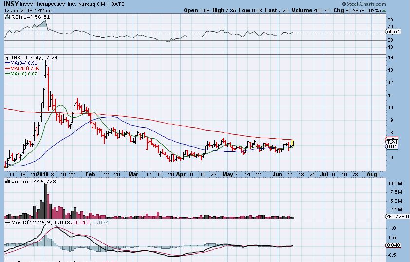 INSY – INSY has been moving sideways and forming a nice base.  A break above the 200sma could start the fireworks. That would be a low risk entry with a stop right under the 200 or 50sma  ( 34 sma is shown, but the 50 is actually in that same area).