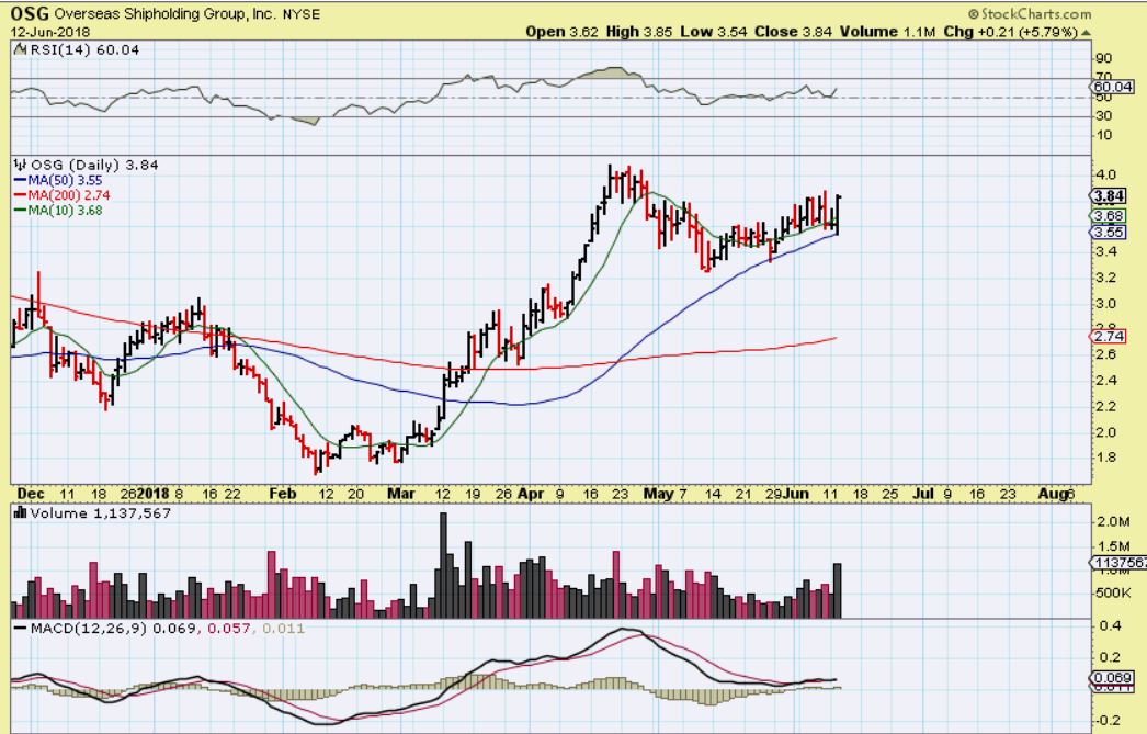OSG – I get a feeling that it is preparing to take off.  It closed up almost 6% and at the highs of the day, with strong volume. I own it & added, stop at the 50sma.