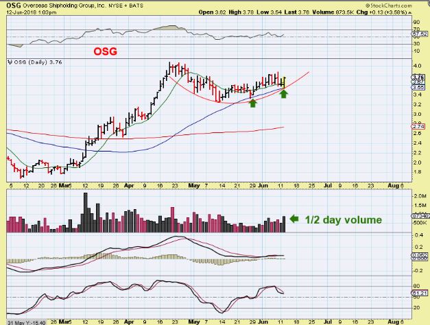 OSG – I’ve been pointing out OSG, and it started to move with strong volume off of the 50sma yesterday, so I posted this midday. It was up 3+%.  It is still a but, but…