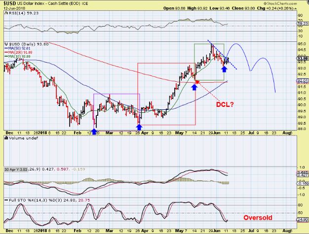 USD WEEKLY #2 – That was a strong rally & right translated, so I would expect a pretty good bounce after the drop & the dcl is in place.  That dcl is due now.  Is that short term Bad News for Gold?  MAYBE, MAYBE NOT.  A bounce in the Dollar, as shown, could be ignored by Gold too. We’ll see.