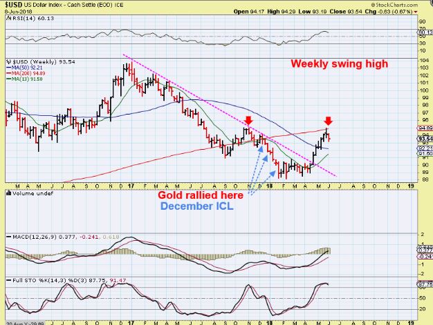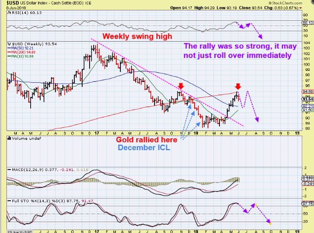 USD WEEKLY #1  – The USD formed a weekly swing high and was rejected at the 200 weekly MA.  That is the good news, since we are expecting an ICL in Gold. THAT 200ma  could be what Tops the USD.
