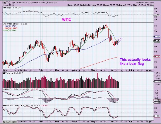 UPDATE: WTIC JUNE 12 / Currently –  And right now, this actually looks like it could be a bear flag. Wednesday is Oil Inventory , so we’ll see what happens here.  We have a swing low above the 10sma, but it could become L.T. & after tagging the 50sma, we’d see one more drop to the 200sma.  Oil still needs watching.
