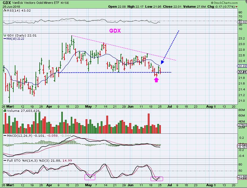 GDX – Matching Golds low, GDX put in a reversal 2 days ago too. It is also oversold on the stochastics, and a little more upside follow through would get it above the 10sma again.