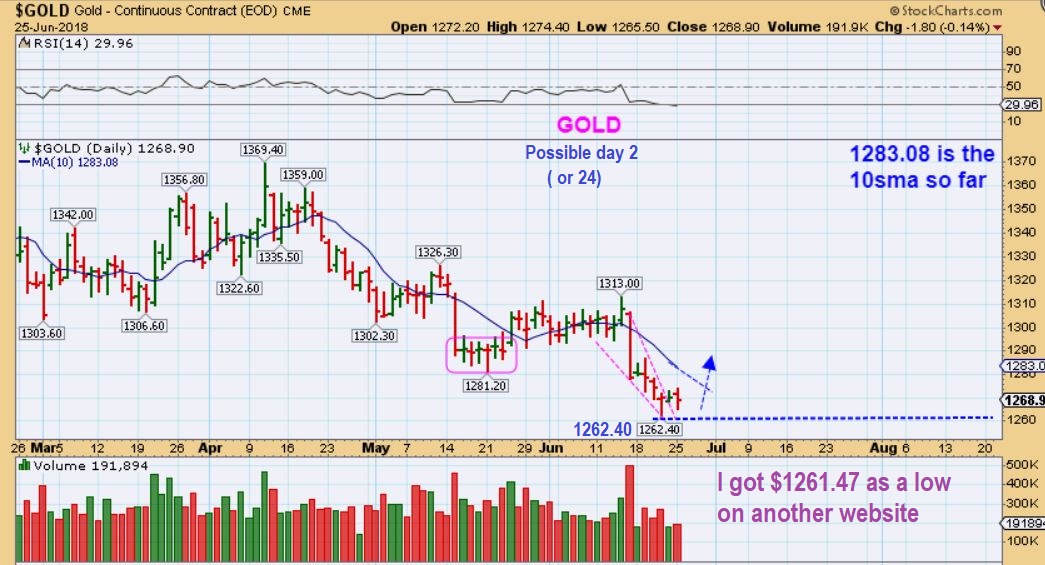 GOLD – So this would be day 2 if the $1262.40 lows hold. It would be day 24 if that day 22 low is not THE LOWS. The 10sma is currently at $1283.08 for a swing low above the 10sma.