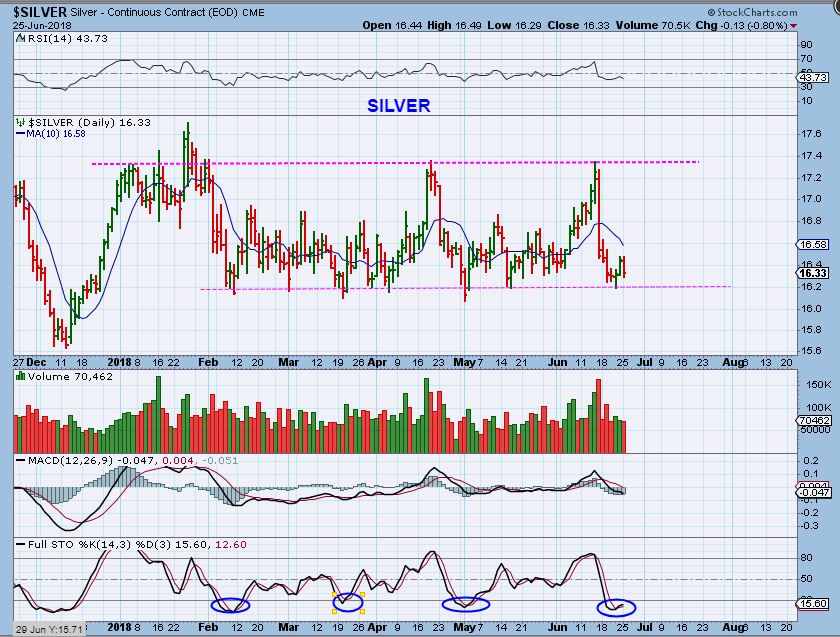 SILVER – Silver is back at the lows of its consolidation and is oversold here too.