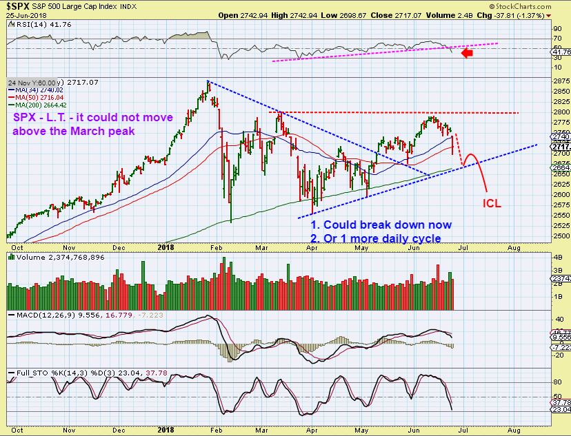 SPX – I had been mentioning in several reports that I wanted the SPX to break above the March highs, or the weakness would bother me. This is why. This has turned into a Left Translated Intermediate Cycle, and should drop to an ICL soon. Read #1 & #2 on the chart.