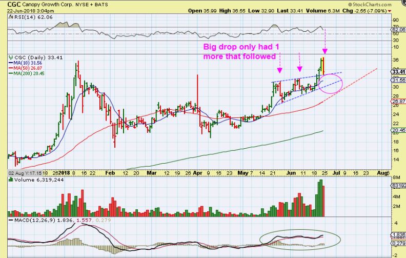 CGC – The break out, the back test and possibly will drop to the 10sma or maybe even the lower blue trend line.  All bull markets have big drops-  look at all of your tech stocks recently like MU, CREE, SQ, etc –  THEY ARE NOT EASY RIDES, but can be rewarding if you dont get bucked off.