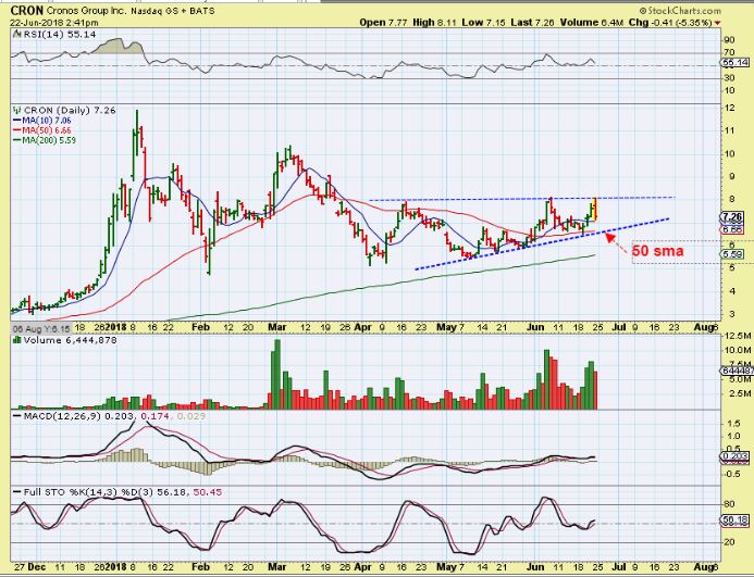 CRON – Same story here, it seems to be inside of a triangle. It is choppy, but it has run from about $5 to $8 and is still bullishly set up.