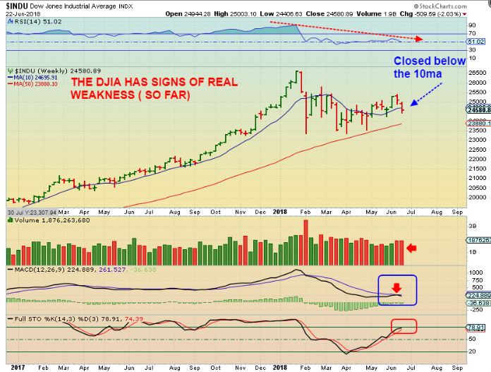 DJIA WEEKLY – The Dow has a swing high on a weekly basis, and lost important weekly support, so we’ll see what happens next week. The MACD actually looks bad.  This CAN drop.