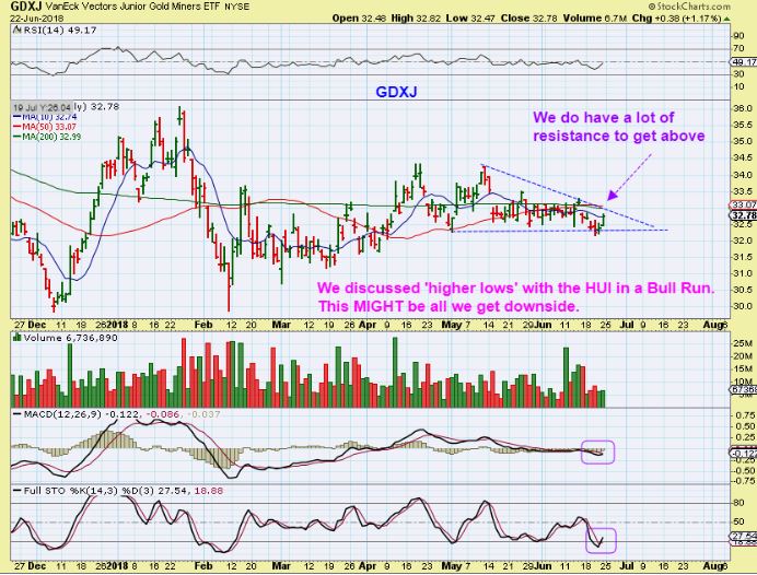 Side Note:  USE A STOP IF YOU OWN LEVERAGE & CANNOT STAND DRAW DOWN.  A drop in Miners is still possible and could be sharp & fast  (But I do expect that it would reverse out of the lows soon if that happened).  You could see JNUG drop to $12, and then take off to $20, for example.