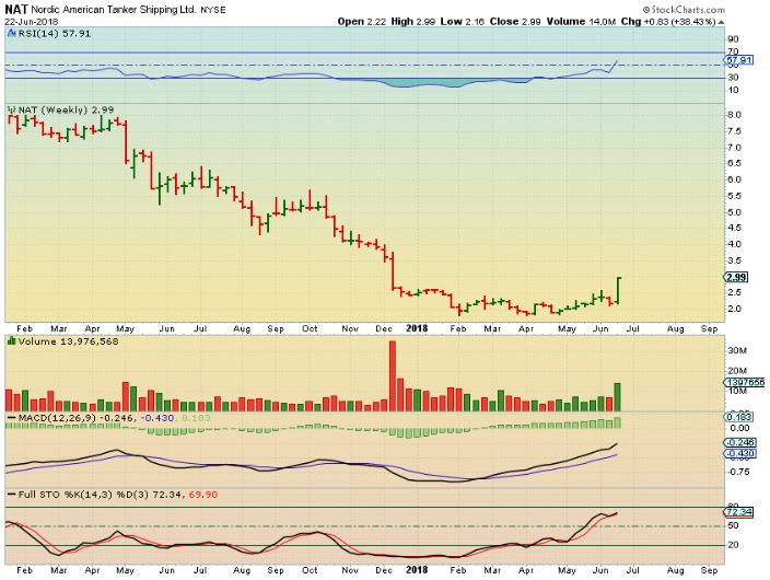 NAT –  It closed up  close to 40% for the week and closed at the highs.  These Shippers are running strong out of solid bases.  Keep your eyes on Shippers too.  For example: I own & like the 5 yr wkly chart of OSG