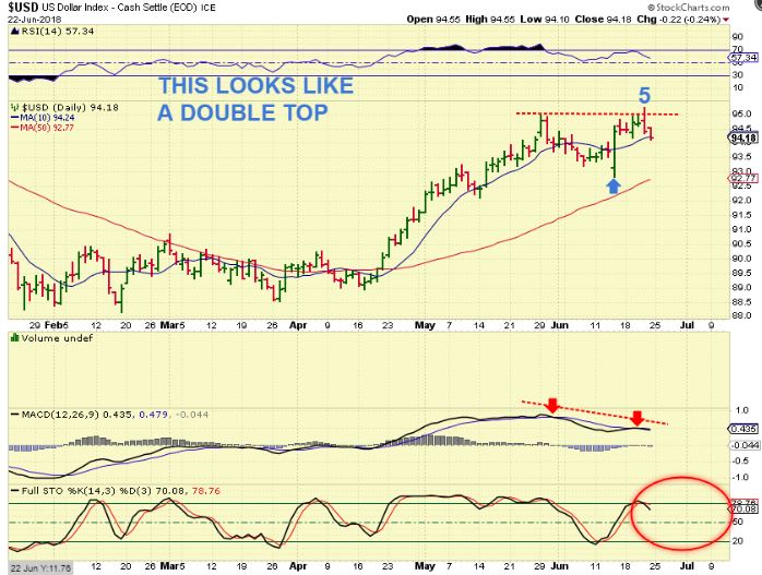 USD DAILY– A day 5 peak and a swing high, I am expecting a L.T. Daily cycle and so far this could be topping .  The MACD says “a possible double top’ is playing out.
