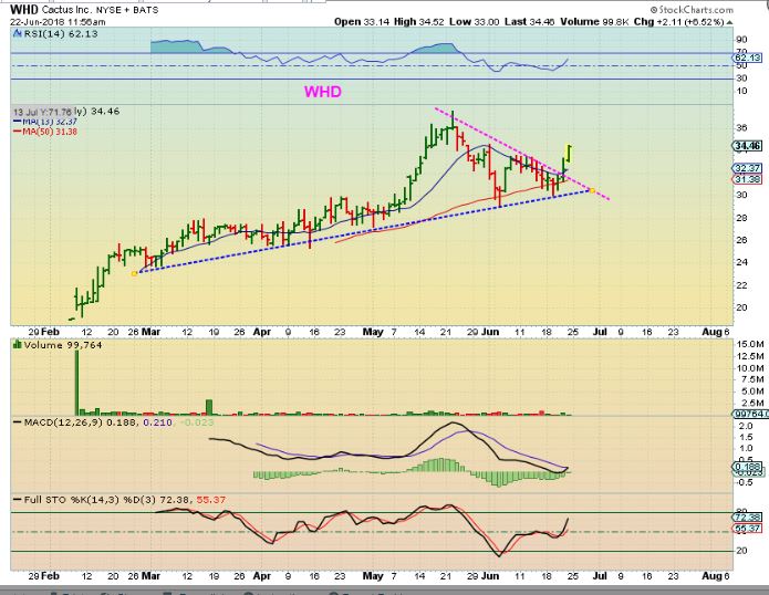 WHD  –  We traded this a few months ago and then it just consolidated those gains from under $20 to almost $40.  It broke out this week and looks bullish.  IF THE MARKETS DROP, this could back test the trend line as a low risk buy area   (Watch list).