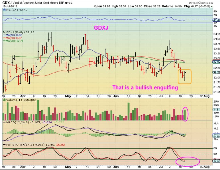 So again,  GDXJ had a BULLISH ENGULFING,  those lows usually are NOT violated.  (  EDIT:  The only way I can see this not violated is if Gold reverses and V-Bottoms before the open). We shall see if Gold reverses before the open .