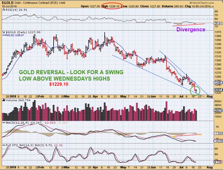 GOLD – This is the Daily chart after the close.  It looks like a BULL WEDGE is forming and Wednesday reversal,  and price divergence. Watch $1229.10 for a swing low unless Wednesdays lows are taken out.  A break above the trend line is also likely signaling that the selling is done. Notice that the 10sma is there too.   Read the chart…