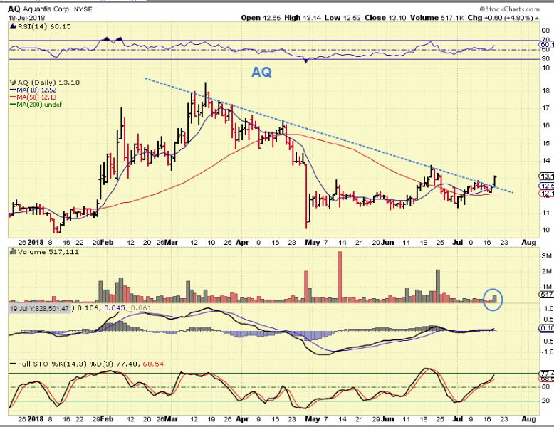 AQ trend line  #1 –   Wednesdays report –  This was posted as a ‘Buy before it breaks out’, or wait until it breaks out and ‘Buy the break”.   It was one of those IPO’s that ran strong but died.   That MACD was bullishly divergent and it showed signs of life!