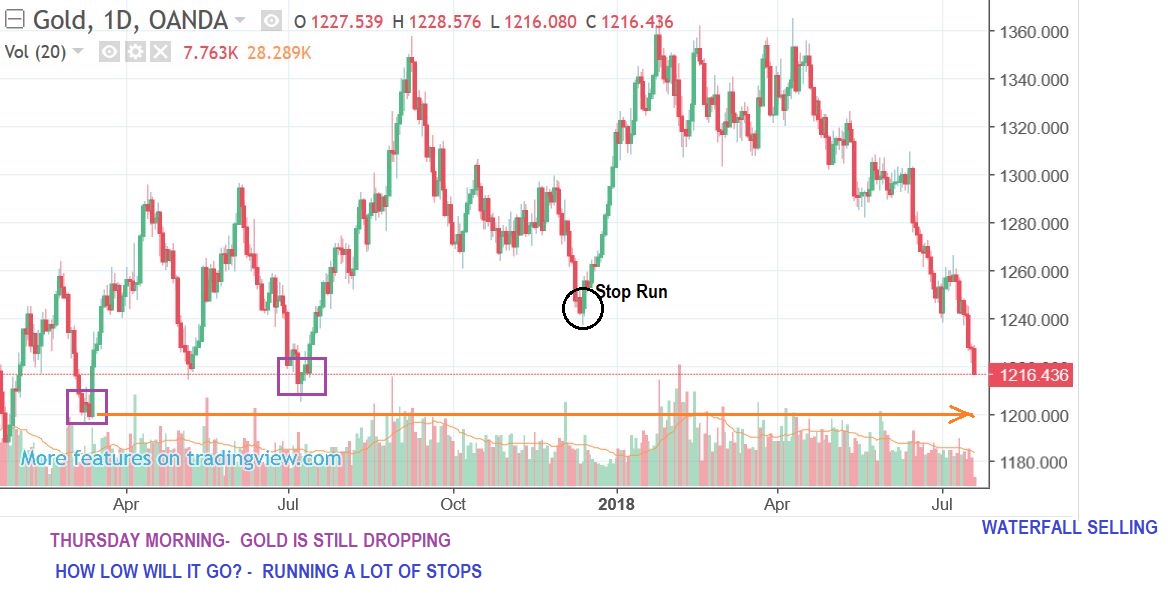 GOLD #1 – This is GOLD UPDATED.  We are in a waterfall type sell off, yesterdays lows have been taken out, and it looks like the stops will be run on former lows too , like last JULY lows.  Below $1200 takes out  the lows from March, etc.   IT SEEMS THAT GOLD IS SEEKING OUT IT’S YCL / ICL / DCL .   We could see a sharp snap back V-Bottom when this is all said and done.