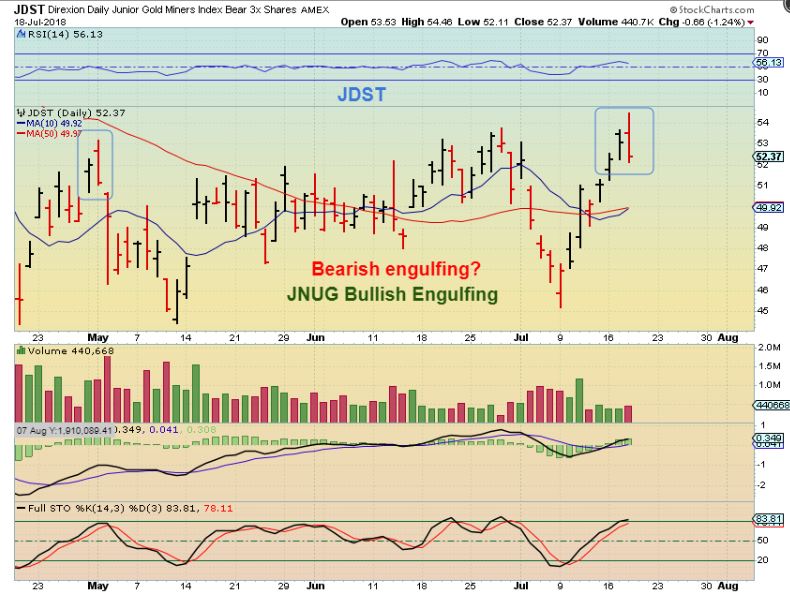 JDST-  This also looks bearish for the 3X bear ETF. A reversal off of the top, and this is a bearish engulfing.