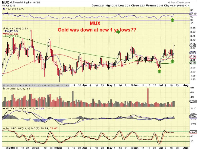 MUX – With GOLD selling off, MUX has a higher low on the 50 sma and moved 5% higher while GOLD sold off.  That really was encouraging for Miners.