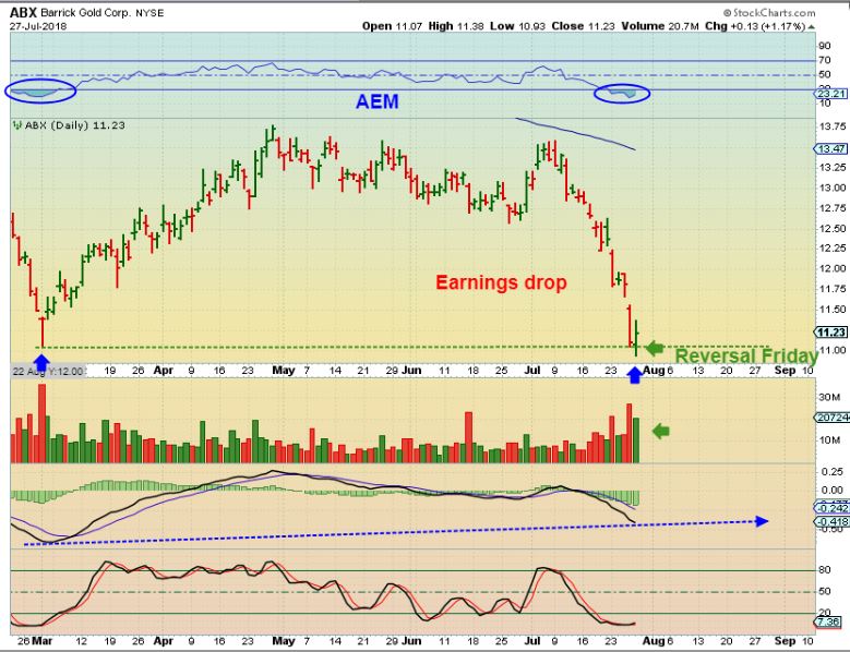 ABX -ABX ( I accidentally wrote AEM on the chart- this is ABX) sold off to the prior lows, broke them on Thursday, and pulled a reversal high volume on Friday. That could be a shake out, it is too early to tell. This sell off looks similar in steepness to the last sell off on the left of the chart. That sell off recovered quickly, so this one could too, when Golds ICL is confirmed and a rally begins.