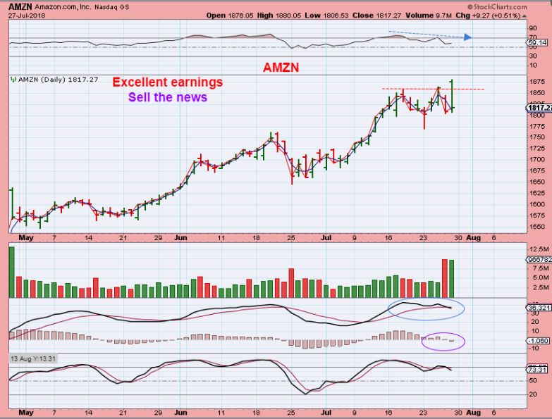 AMZN – AMZN crushed expectation Thursday evening, and then gapped up almost $100 Friday morning. It then sold off into a reversal. Look at the MACD. Did the smart money sell on the gap open?