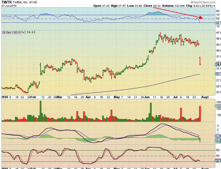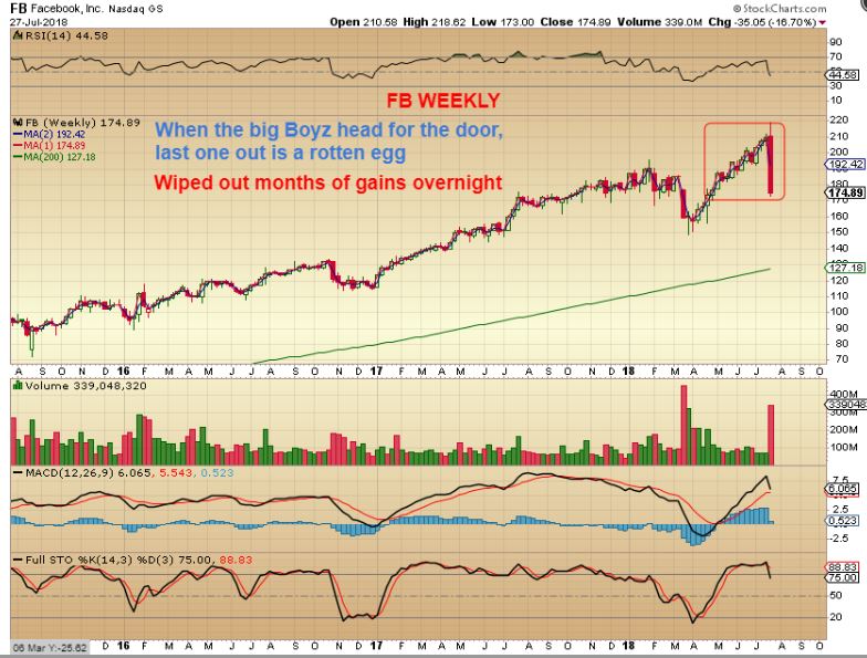 FB WEEKLY – FB missed and got crushed, down 20% Thursday alone. This is a weekly chart, it took back almost 12 weeks of gains instantly, overnight! It gapped down that much.
