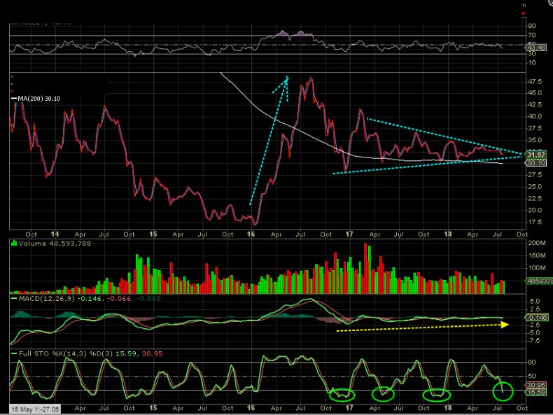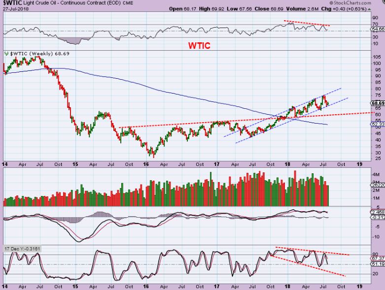 WTIC WKLY – On a Weekly chart we are in a channel and at the lows, but it can drop to back test the red break out.