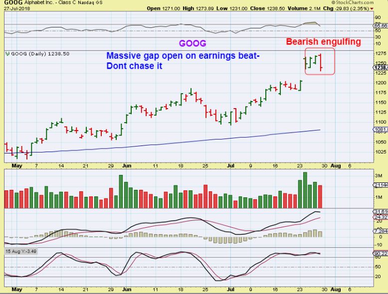 GOOG – This was the headline “Alphabet Earnings Demolish Expectations”, and it also gapped up and ran higher by $70+ points this week. I warned that it could sell off over time, and not to chase it. Friday it sold off and formed a possible bearish engulfing.
