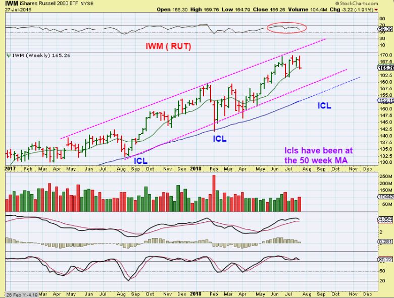 IWM ( RUT) – The Russell 2000 was leading the way in May & June, and now they may be leading the way again, down. I see RSI divergence at that recent top. A channel and the 50weekly MA are possible targets.