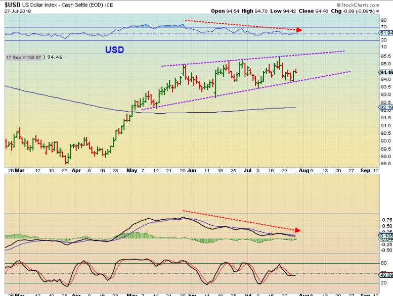 3. The USD has been hitting resistance overhead. Honestly? I think that the WEEKLY USD chart actually looks bullish, but due to ‘cycle timing’ and that strong overhead resistance, I still expect it to drop. That would be bullish for Gold…
