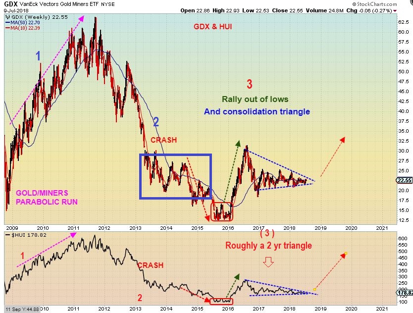 1. A rally to the top & 2. a Crash & consolidation drops into a deep low. #3 A move higher out of the lows was strong, and then a triangle consolidation formed. DO you see where I am going with this? Really look at the triangle consolidations in both the GDX & HUI on this chart.