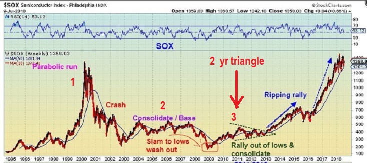 SOX – Look at 1. The famous Tech Parabolic Ramp up of 1999. 2. Then the crash & consolidation. Now look at #3 – That long 2 year triangle consolidation. The rally from that long boring sideways triangle was excellent. Really take a good look at that part of the chart. #3 was a run up out from the lows, then a triangle consolidation , and a strong ramp up…