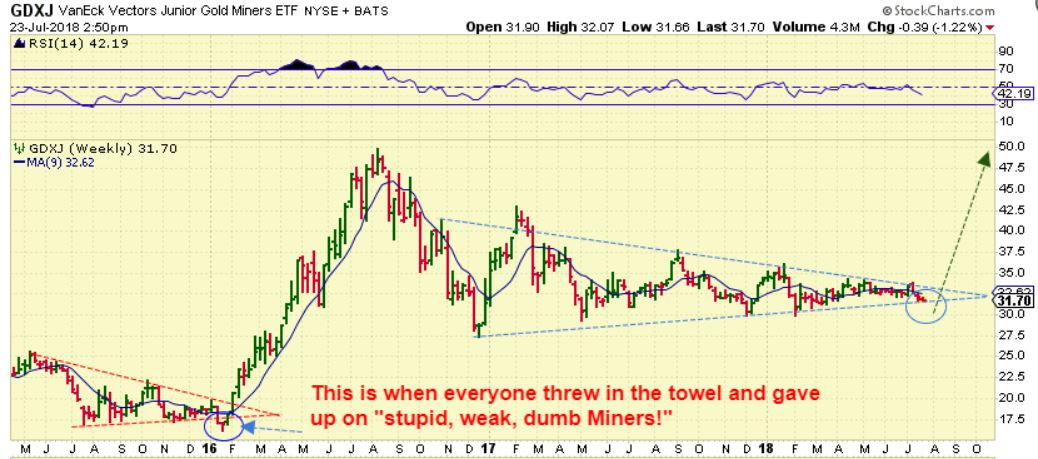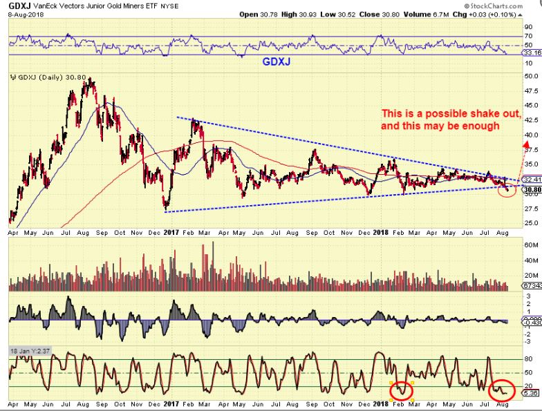 GDXJ – You may recall that on July 23rd,  I drew this chart comparing the triangle now with the 2016 triangle, and I said to look for a little shake out, similar to 2016.  So we should break that lower triangle line.