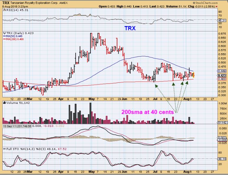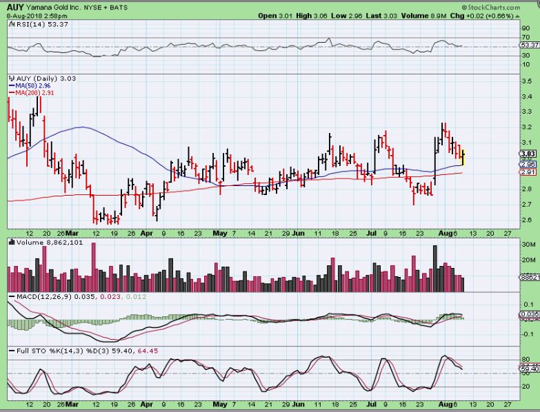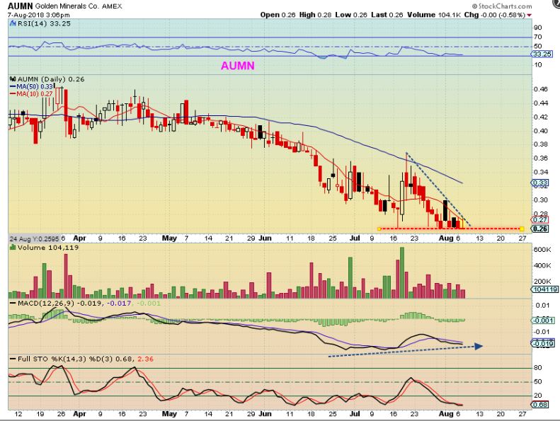 AUMN –  I hate to say this, but I stopped myself out of AUMN,  and I feel that I should have just left it alone this late in the daily cycle.  It was a small starter position,  average 28 cents, and I sold it for 25 cents when it broke this support ( the break is not shown here).  I liked the July  POP as a sign of strength, so I can always get back in if I need to.