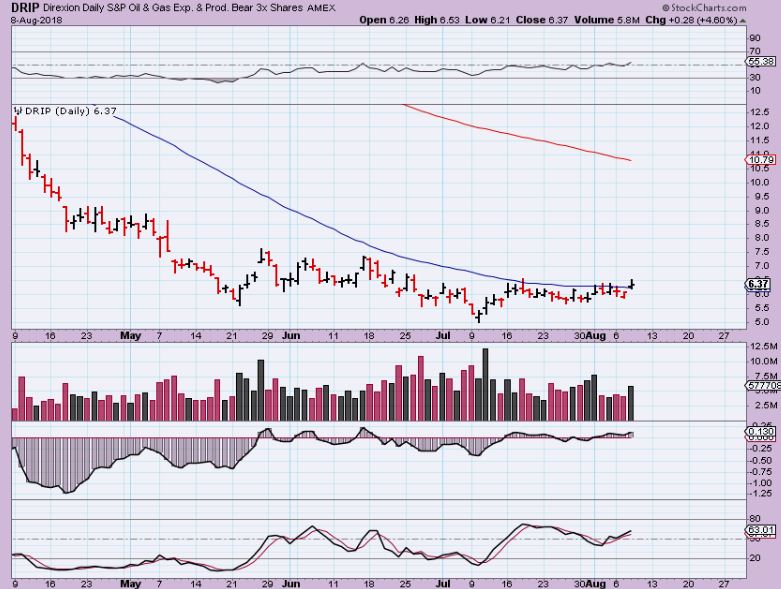 DRIP  – I thought that the XLE held up well so far,  but the OIH is weaker.   DRIP  popped above the 50sma and then fell back a bit today, but it could make a run if energy the sector drops down with Oil.   It could be bought with a stop under Tuesday, I would say  ( Or the 50sma if you prefer).