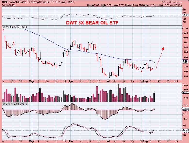 DWT  – 3x ETF short Oil. You could buy this after it breaks above the 50sma , or start a position here with a  ‘stop’ close by.  Oil could bounce around, but since I expect Oil to break down to the  200sma, you could ride DWT until Oil gets to the 200sma.