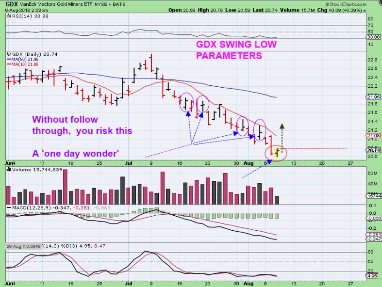 GDX –  I mentioned that GDX had what could be a bullish last engulfing on Tuesday. I mentioned that a slight dip and recovery would lower the parameters for a swing low.  We got the reversal,  BUT YOU CAN SEE that we’ve had a few other reversals along the way too, right?   So a little follow through higher, and some short covering would be nice  🙂   It is day 28, and that is very good for timing of a dcl.