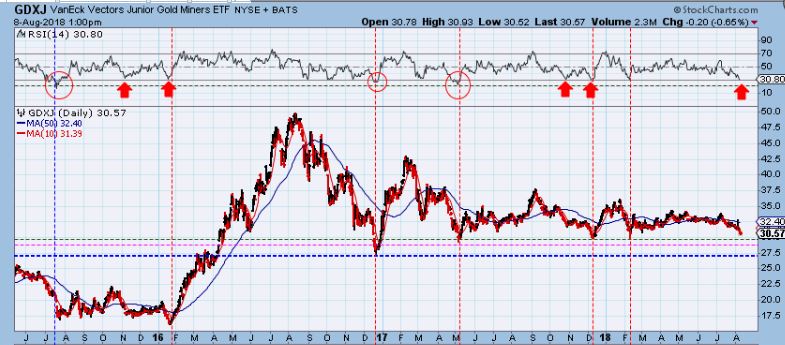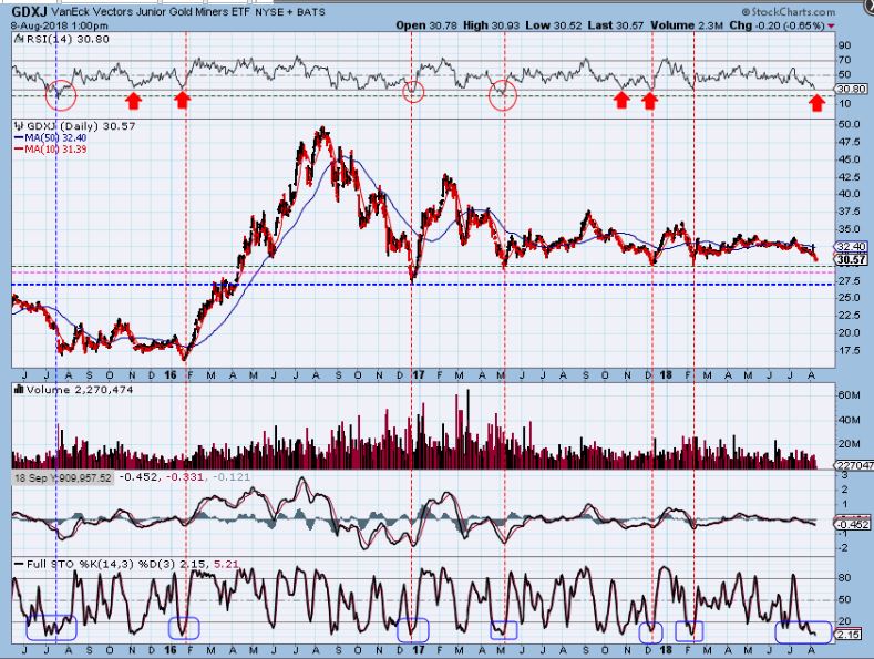 GDXJ – We dont have to drop further, and let me explain.  GDXJ is  certainly oversold enough, and the  RSI is where prior lows have formed, but also…