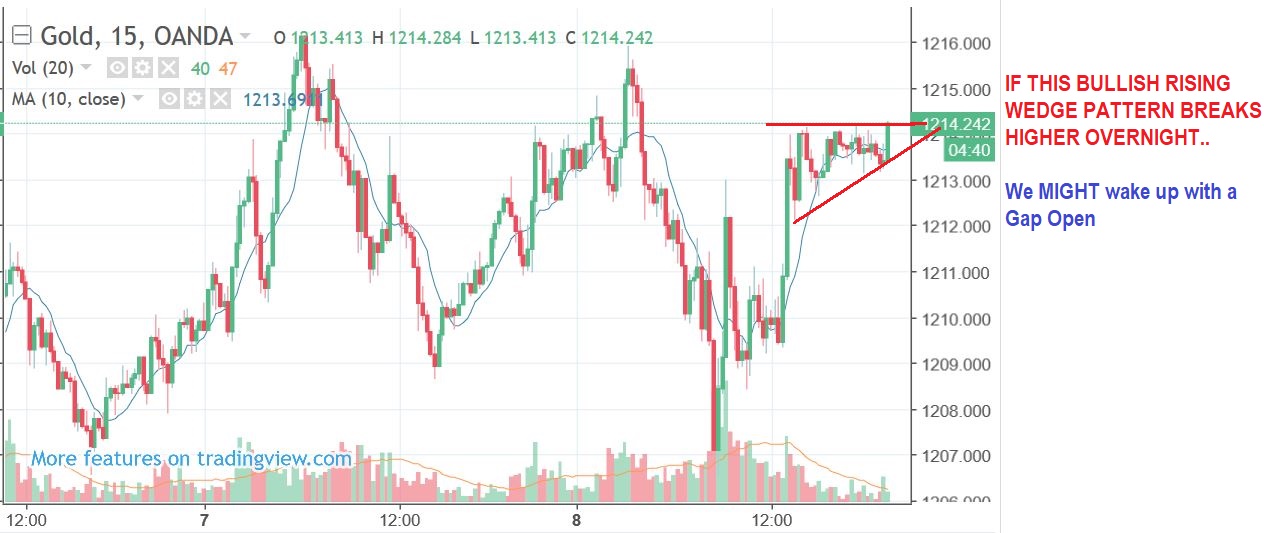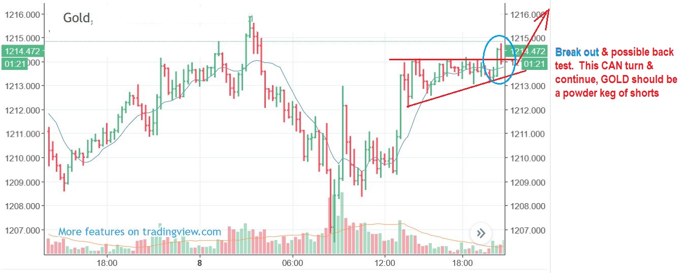 Note: I started  writing this on Wednesday night at 6:30  P.M. Eastern  and GOLD just set up what looks to be a bullish rising wedge pattern as I was writing,  and they usually break out higher.  This is GOLD as I write, please read the chart…