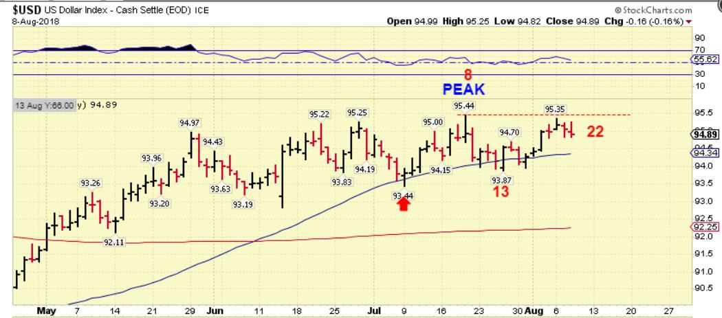 USD –  We  still have our day 8 peak, so there is still a chance that this will drop into a DCL  and stay left translated. That would / Should help Gold, and the next daily cycle would drop faster into an ICL.