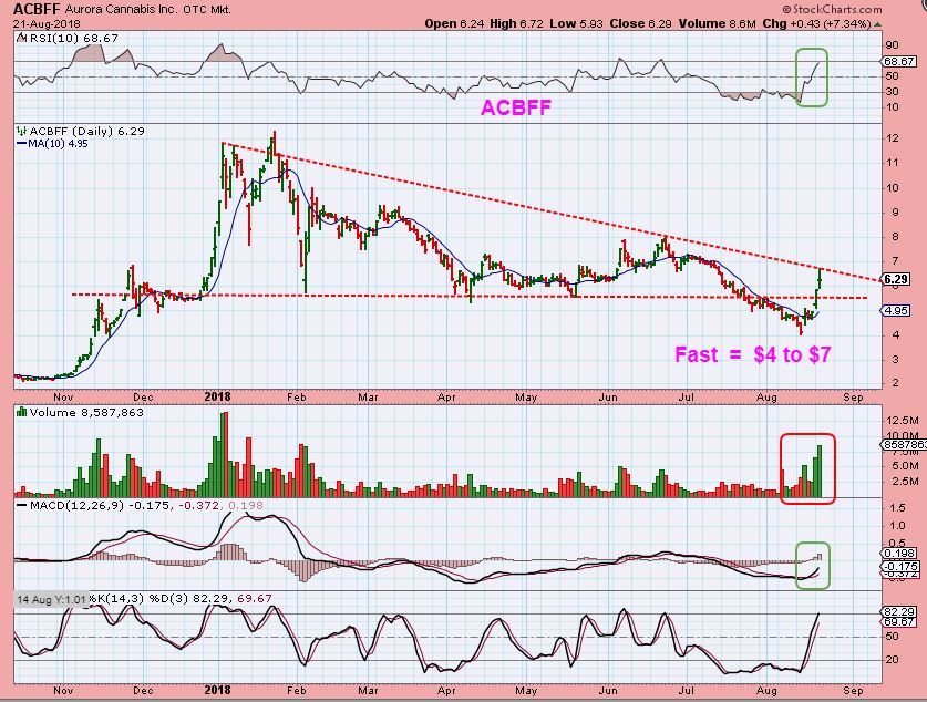 ACBFF – Notice the Bull flag just above the 10sma. I bought this one then. I mentioned several of these yesterday, and I just wanted you to see how very fast they move. The problem is, they can drop just as fast, so it is important to buy them while they are in their base, Or on support, ( You’ll see volume swell before they pop) or buy them on a back test of support later.