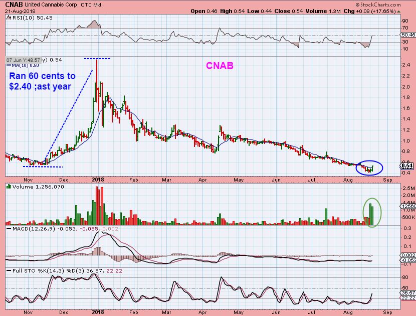CNAB – For example, this is low in the base, but you see volume coming in. It actually ended up almost 20% yesterday alone, but these are known to move 20% a day for 2 or 3 days in a row. A 1 day trade is often all you really need to grab some gains and eliminate risk quickly.