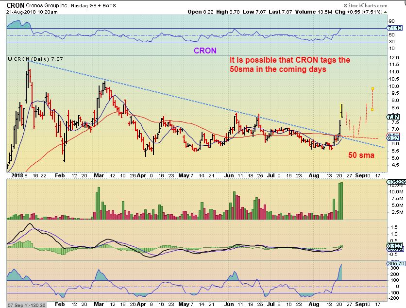 CRON – Notice the same bull flag under the 50sma that MJ ETF had. If you see an MJ stock with that, you may want to buy it with a stop 🙂 I used this in the comments sector simply to show a gap open was now dropping, it might tag that 50sma, but it closed the gap & reversed higher again. This still could happen over time.