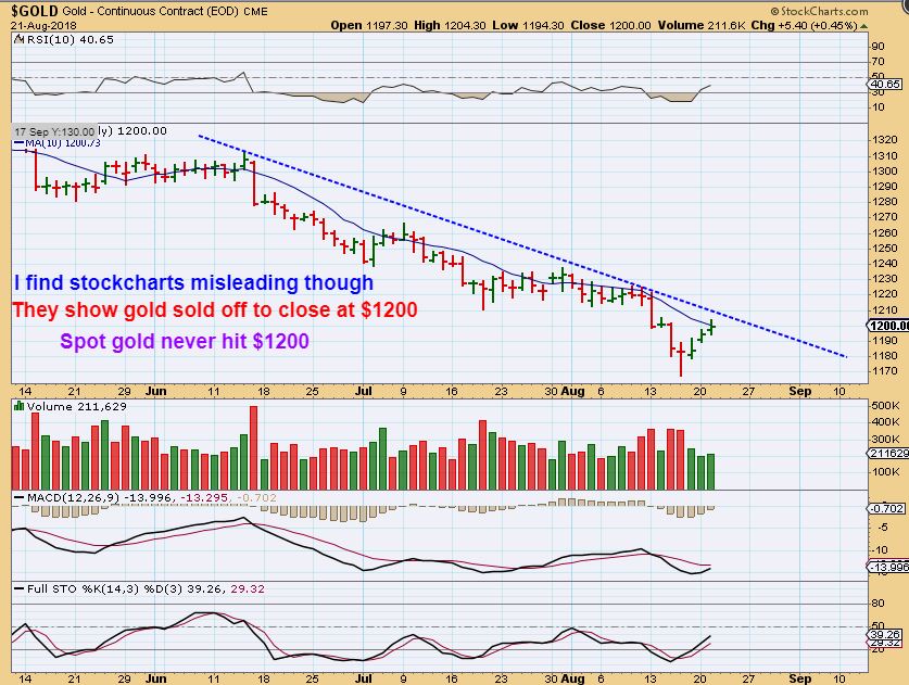 GOLD – Stockcharts shows Gold hitting 1204 and selling off, above & below the 10sma, but I find this chart misleading, since spot never hit $1200. AFTER an ICL is confirmed, I will switch to stockcharts, but for now it is difficult to gauge where the 10sma & the trend line should be, since this chart changed with the contract change.
