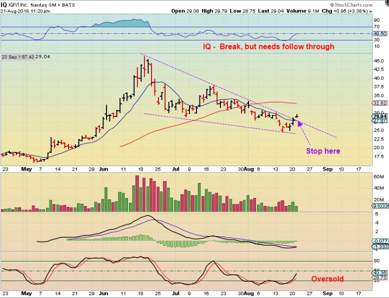 IQ – I posted this before midday, it closed at $29. It has moved above the 10 sma and could be a buy with a stop if you are looking for a TECK trade. I have to caution again about the FOMC Minutes and the fact that NASDAQ looks weak ( But small caps look good).