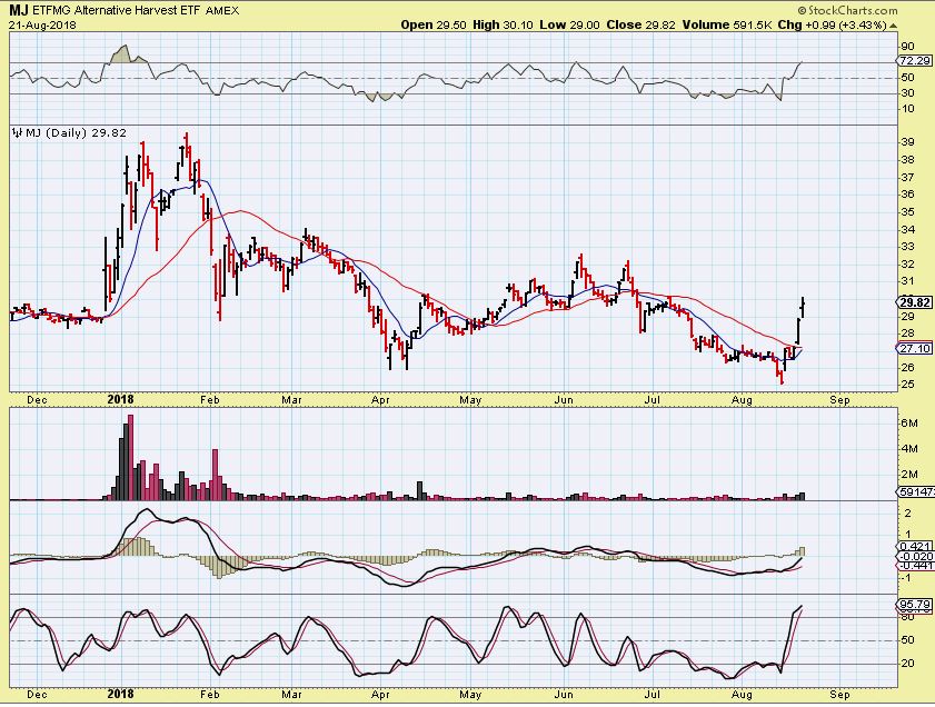 MJ – This is the ETF for the Medical marijuana stocks. I wish I had pointed it out 2 days ago as it sat forming a bull flag under that 50sma. $25 to $30 in a few days is FAST for a normal etf. This sector moves like leveraged etfs. It could keep pushing higher, but if it drops to back test the 50sma, it will be a buy.