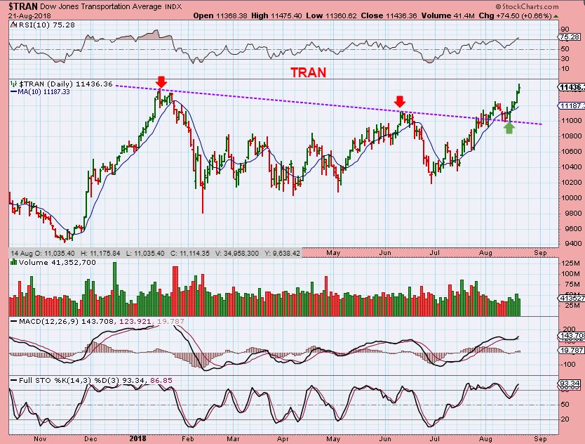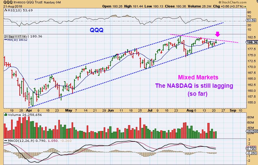 TRAN – After selling off in June, The transports have actually had a nice run from early July, back tested a break and continued higher. So we do have mixed markets, but maybe NASDAQ is getting ready to play catch up. The DJIA also broke out last week, as noted in prior reports…