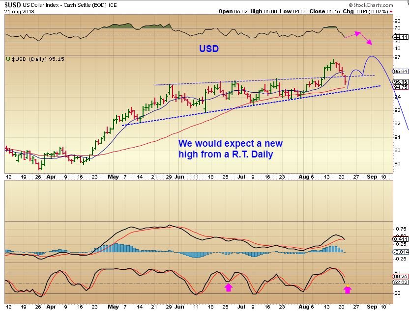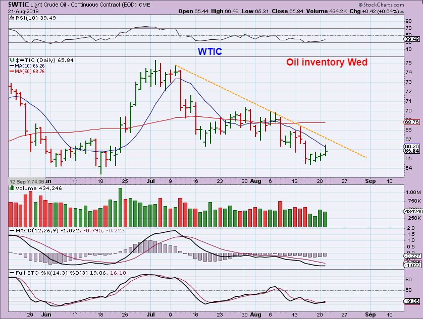 WTIC – Oil has remained fairly weak, the Inventory report Wednesday will reveal whether or not we got a dcl 3 days ago. We are within the timing for a daily cycle low, day 42 was the low Thursday. This was day 3 or day 45.