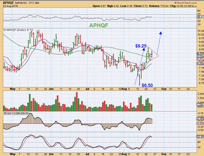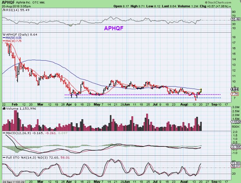 APHQF – It has only been 4 days since Aug 20, and this closed above the 50sma, dropped back under to the 8 EMA, and yesterday put in a doji.  This could be a small flag before a move higher.  I own it from last week and added this week.