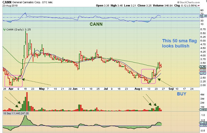 CANN–  As mentioned before,  I do like to see volume on the Pops, and CANN Popped with increased volume off of the lows, then it tagged the 8 ema and Popped for 2 days again. It has now flagged again along the 50sma.  Give it another day or so and it may burst higher again.